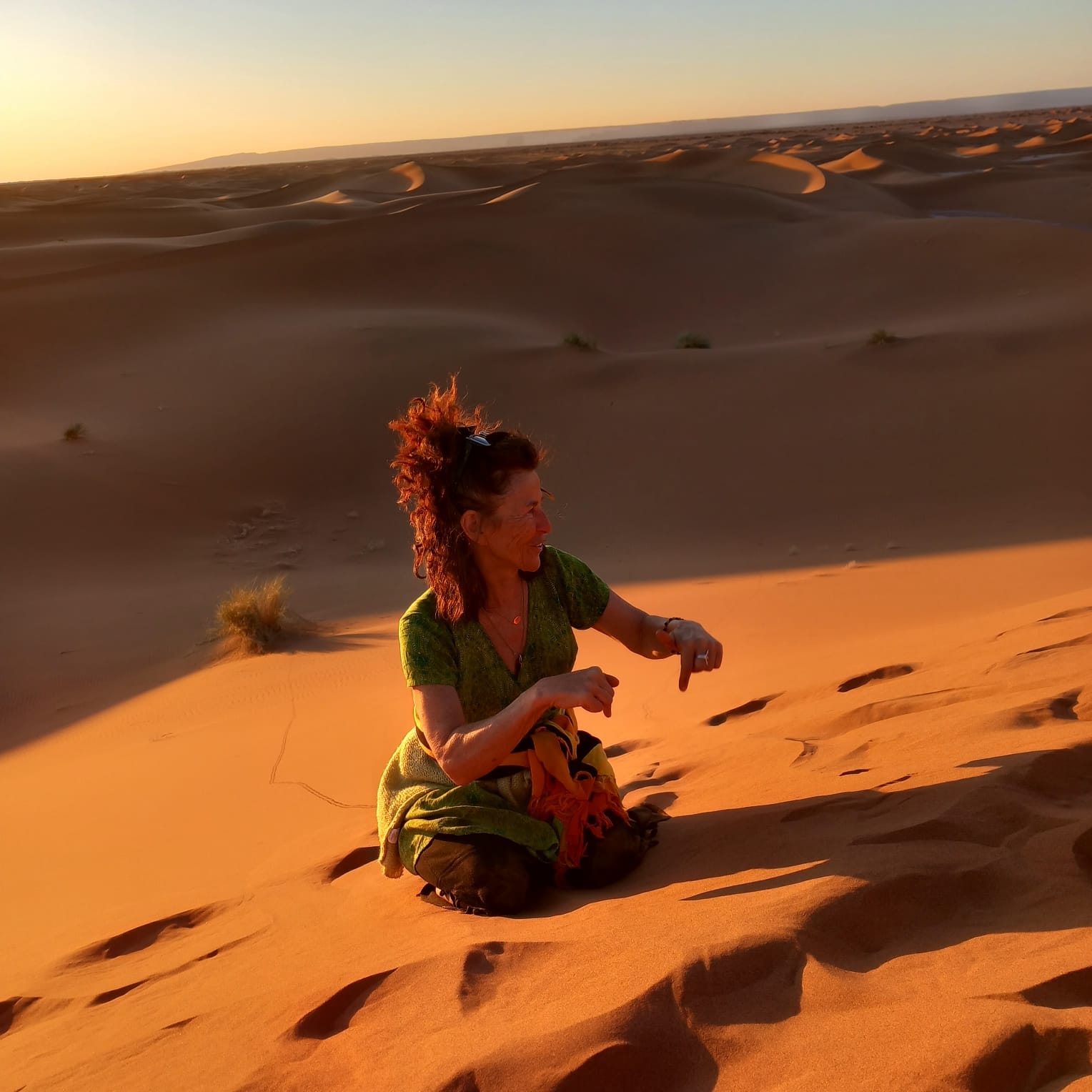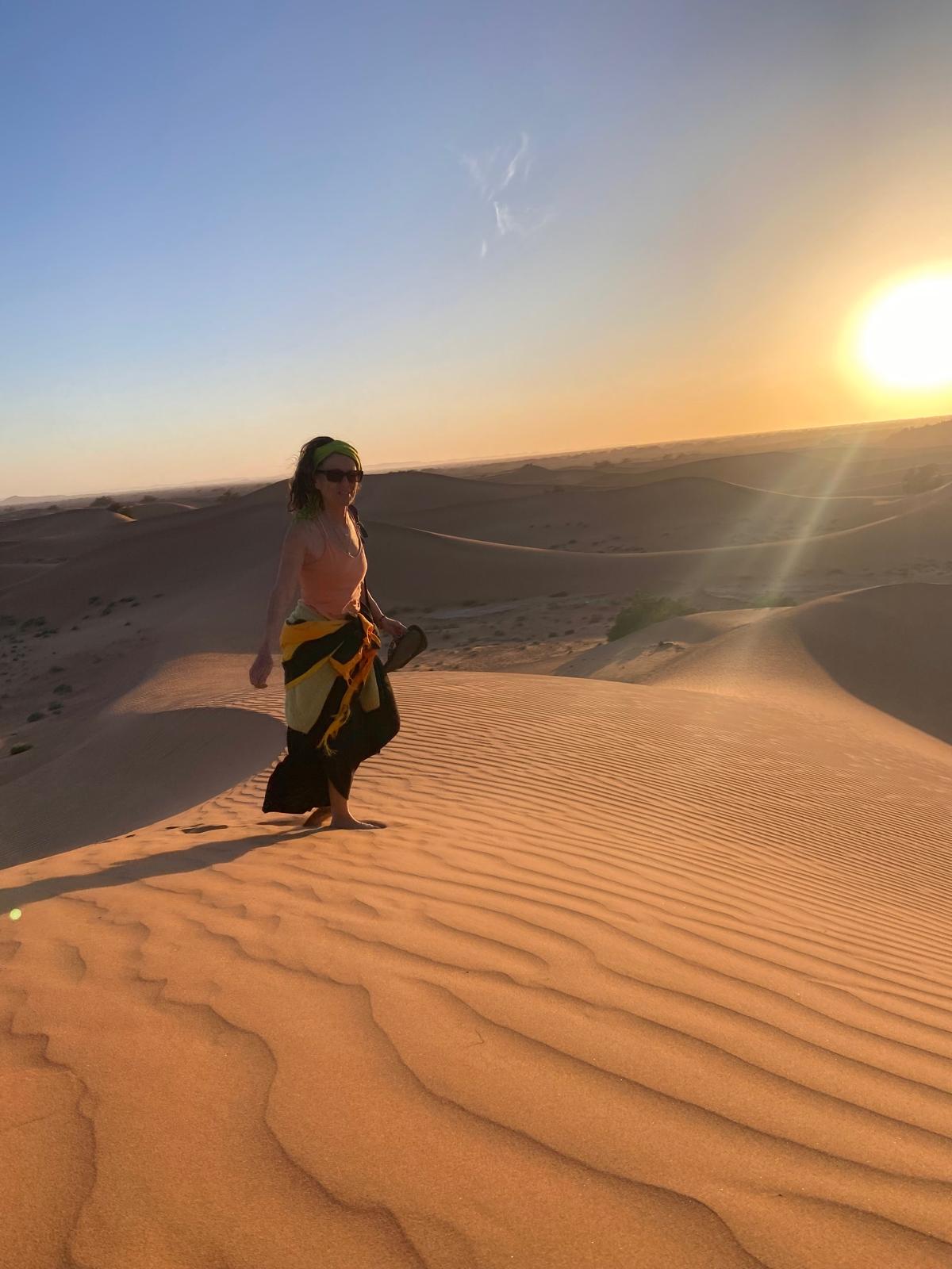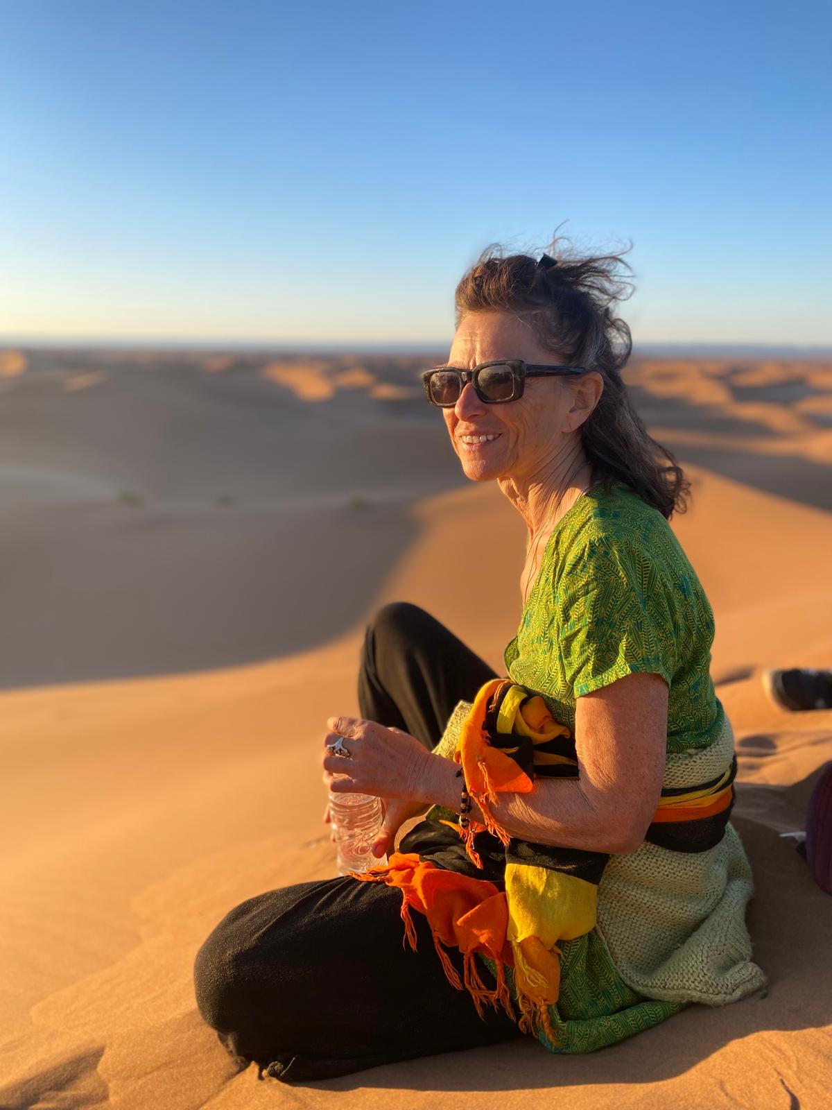 Quel voyage ressourçant! Merci Magali pour m'avoir permis de découvrir le désert du Sahara dans ces conditions optimales pour moi. J'ai adoré rencontrer les gens sur place de manière authentique, chanter et danser avec eux et lors de tes propositions d'ateliers. Je me suis régalée les yeux de ces paysages à perte de vue, et les papilles avec les tajines délicieux et les mlaoui (oh oui!!). Et cerise sur le gâteau j'ai encore une fois grandement apprécié la qualité de ta guidance en qi gong et pour la voix spontanée, du vrai bonheur! Ce qui m'a aussi convenu à 100%, c'est la souplesse dans tes propositions qui permettait d'avoir toujours le choix de participer ou d'écouter son propre rythme. En résumé je suis ravie d'avoir fait partie de ce merveilleux voyage.