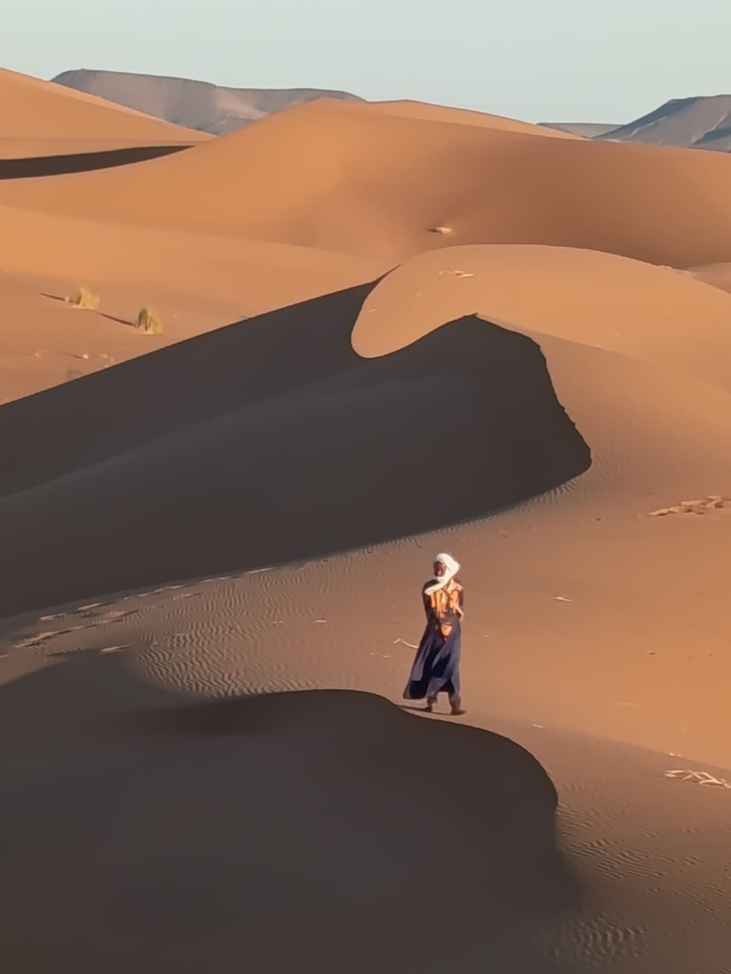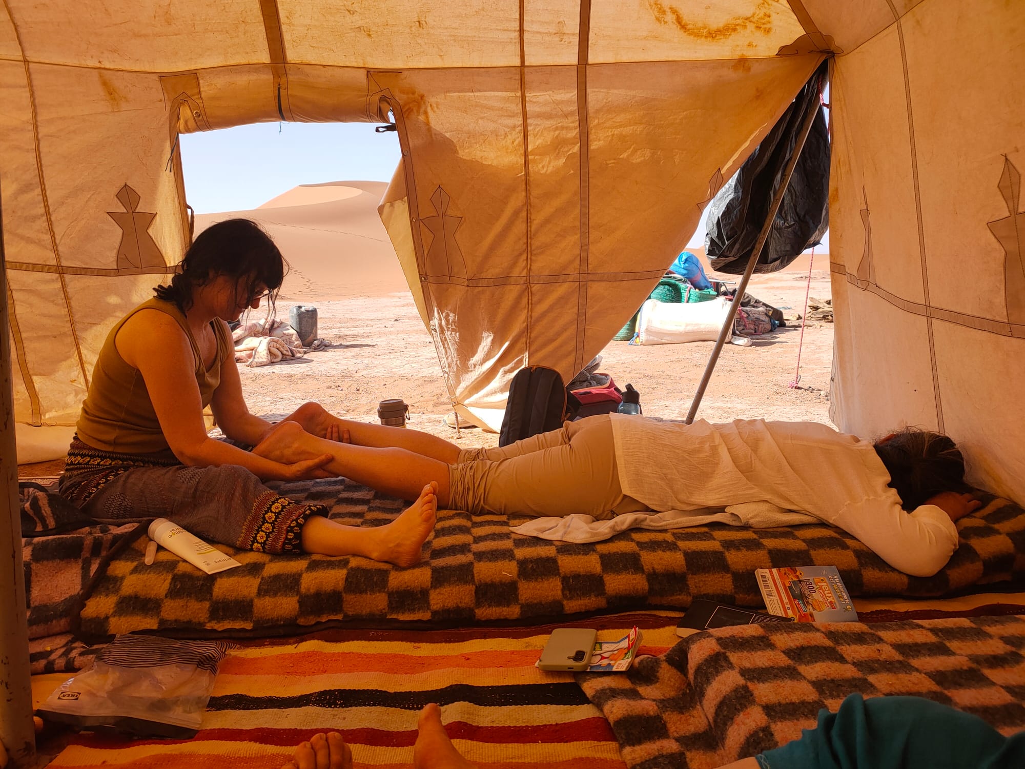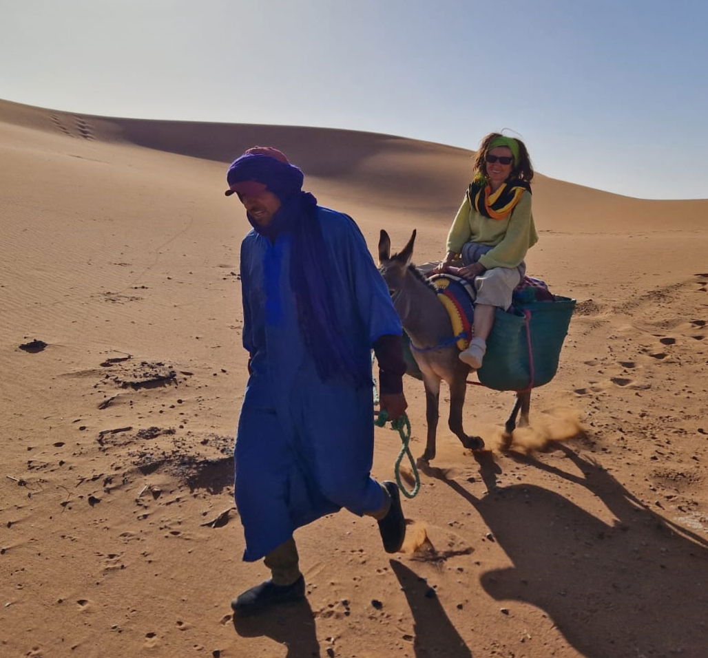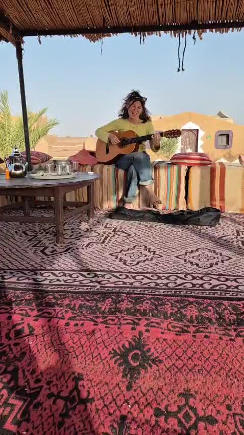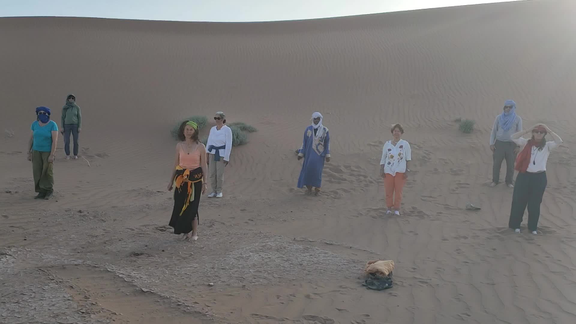 Imaginez un bivouac au milieu des dunes, le silence, la chaleur (du moins dans la journée, où la sieste est la bienvenue, car la nuit plutôt une douce fraîcheur), les couleurs des dunes qui changent selon heure de la journée, quelques dromadaires qui passent au loin... Et là, un groupe qui pratique le qi gong au lever du soleil, qui chante à ombre des tentes, improvisant en groupe ou individuellement au son du djembé ou de la guitare, avec du temps pour des échanges informels (dans le groupe et avec nos hôtes), des pauses thé, des repas délicieux, des soirées de rencontres avec des musiciens locaux... et un rendez vous sur une dune pour admirer le coucher de soleil sur le désert! Est ce que nous a permis de vivre Magali dans le stage "qi gong et voix dans le désert marocain" en novembre 2023, une parenthèse enchantée dans ma vie, une pépite dans mon cœur qui va continuer longtemps à me réchauffer! Merci à toi Magali!