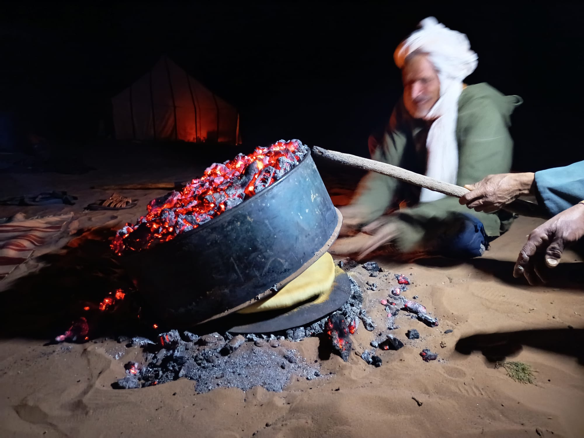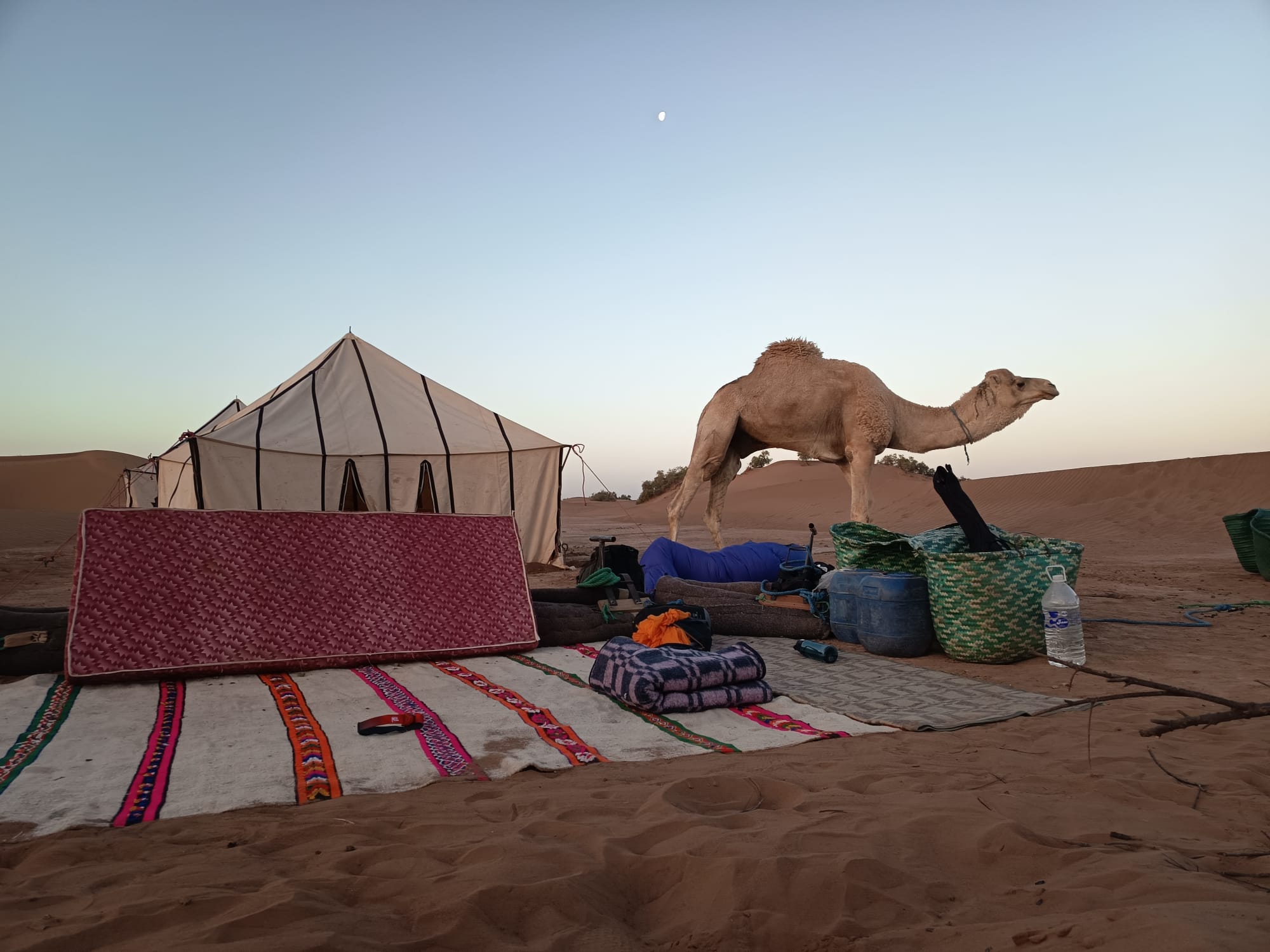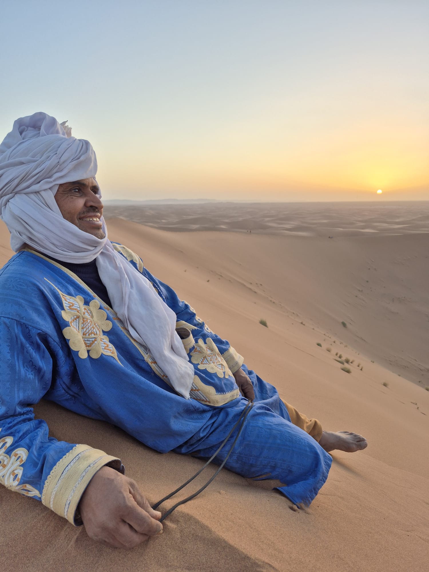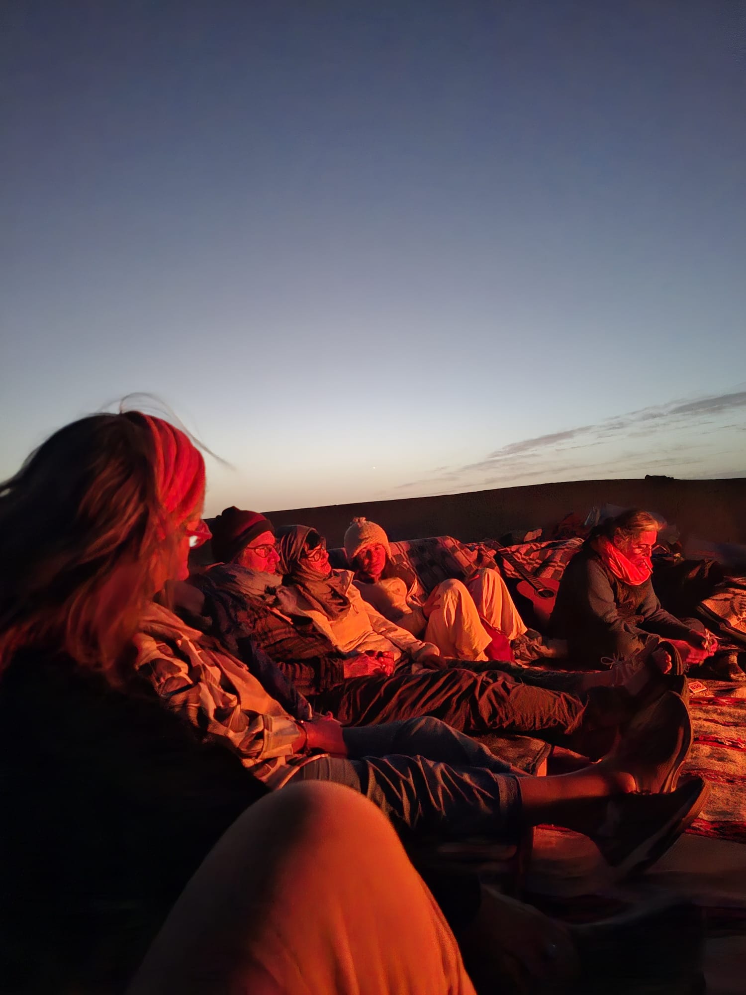 Imaginez un bivouac au milieu des dunes, le silence, la chaleur (du moins dans la journée, où la sieste est la bienvenue, car la nuit plutôt une douce fraîcheur), les couleurs des dunes qui changent selon heure de la journée, quelques dromadaires qui passent au loin... Et là, un groupe qui pratique le qi gong au lever du soleil, qui chante à ombre des tentes, improvisant en groupe ou individuellement au son du djembé ou de la guitare, avec du temps pour des échanges informels (dans le groupe et avec nos hôtes), des pauses thé, des repas délicieux, des soirées de rencontres avec des musiciens locaux... et un rendez vous sur une dune pour admirer le coucher de soleil sur le désert! Est ce que nous a permis de vivre Magali dans le stage "qi gong et voix dans le désert marocain" en novembre 2023, une parenthèse enchantée dans ma vie, une pépite dans mon cœur qui va continuer longtemps à me réchauffer! Merci à toi Magali!