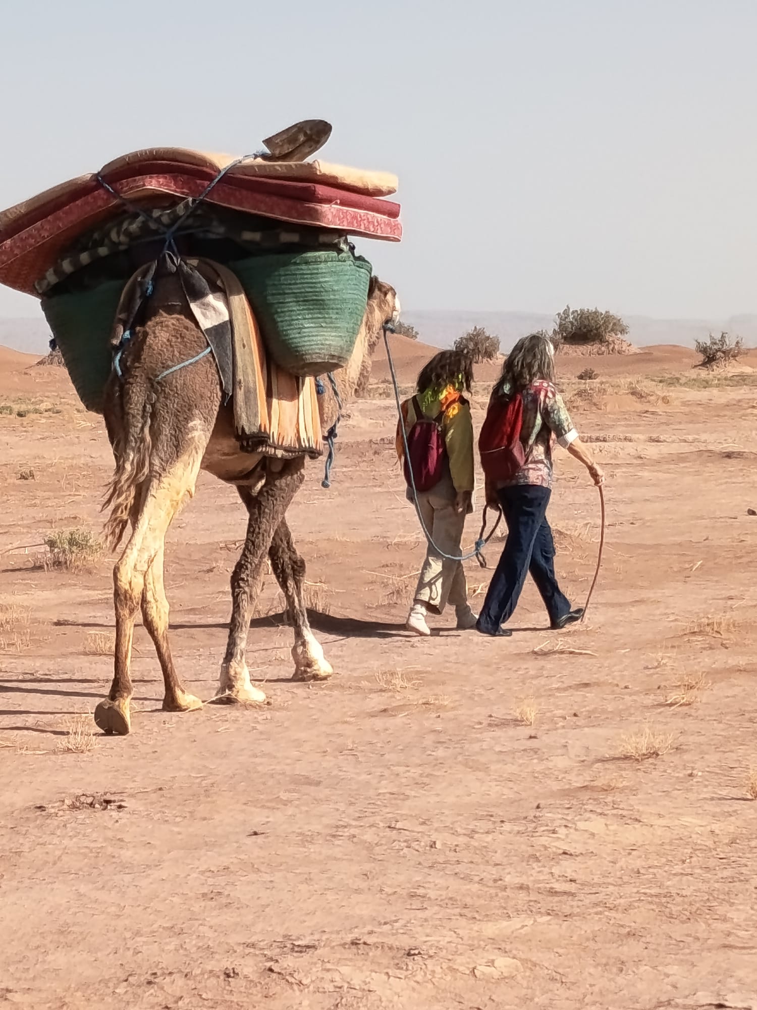Stage Qi Qong et voix dans le désert marocain" Par Sylvie Je reviens d'un magnifique stage avec Magali dans le désert marocain. Une vraie caverne d'Ali Baba tellement il y avait de trésors à recevoir, dont nombreux se sont invités dans le programme. Pour ne citer que quelques-uns : le travail sur l'ancrage par divers moyens (Qi Qong, exercices de voix, expérience du désert, atelier de poterie improvisé, balades en dromadaires, percussions, danse...), la rencontre avec les autochtones, leurs us et leur musique, les éléments naturels si présents (soleil, étoiles, sable, air), les paysages à couper le souffle, notamment au lever et coucher de soleil, les couleurs si intenses, la nourriture excellente et saine, le thé à la menthe à chaque rencontre, la simplicité et la gentillesse des habitants et leurs sourires si authentiques. Le Maroc, le désert et ses enseignements ont fait partie intégrante du stage pour amener chacun des participants dans un cheminement rempli de lâchers prises, de découvertes, d'ouverture de coeur et de rencontres, à commencer par la rencontre avec soi-même je dirais. Bref, on ne revient pas pareil que l'on est parti et c'est tant mieux. Je salue pleinement le professionnalisme de Magali et le ton qu'elle a su donner à ce stage, avec une organisation sans faille et un programme riche d'apprentissages. C'est avec une présence à la fois certaine, bienveillante et discrète qu'elle a su guider le groupe dans une dynamique particulièrement porteuse et permettant à chacun de se révéler un peu plus, en ayant également la souplesse (ou la malice ?) de prévoir de la place pour simplement accueillir ce qui est là pour nous. Le rythme fluide était parfaitement cohérent avec la pratique du Qi Qong enseignée et nous avons volontiers adopté la philosophie débonnaire à la marocaine, conquis par le bercement des pas des dromadaires, dorénavant inscrit dans nos corps de cavaliers. Un voyage autant intérieur qu'extérieur, d'une grande justesse à tous les points de vue. Je recommande chaudement (même si il fait aussi froid dans le désert !)